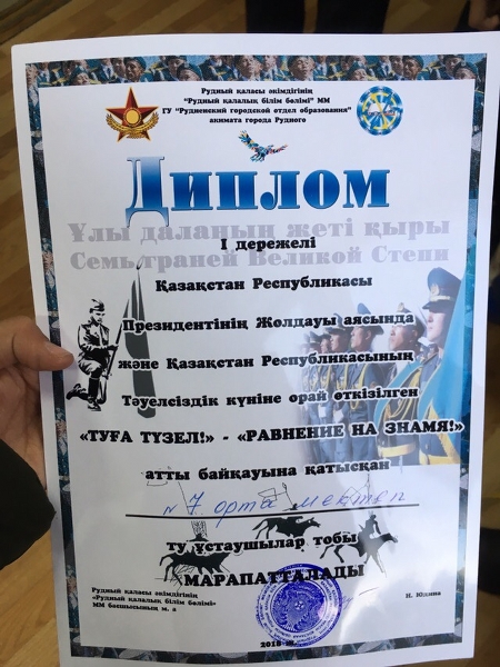 №15 orta mektebinde Qazaqstan Respýblıkasy Prezıdentiniń Joldaýy aıasynda jáne Qazaqstan Respýblıkasynyń Táýelsizdik kúnine oraı ótkizilgen qalalyq "TÝǴA TÚZEL!" - "RAVNENIE NA ZNAMIIa!" atty baıqaýǵa mektebimizdiń tý ustaýshylar toby qatysyp júldeli 1-shi orynǵa ıe boldy.