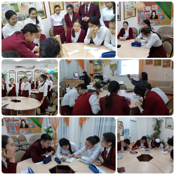 Суретте: «Уақыт капсуласын дайындау – бұл болашақтағы өзіңізге арналған болашаққа хабарлама» кері байланысында 10 «А» сынып білім алушылары өздеріне жолдау жазу сәтінен көрініс.