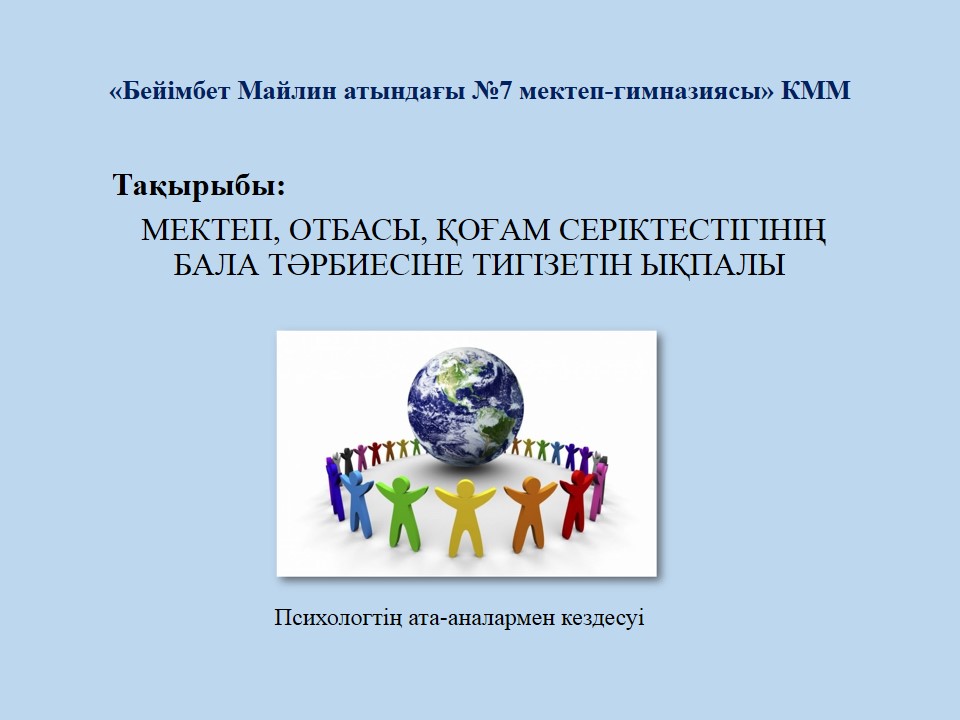 06.11.2020 жылы «Бейімбет Майлин атындағы №7 мектеп-гимназиясы» базасында МЕКТЕП, ОТБАСЫ, ҚОҒАМ СЕРІКТЕСТІГІНІҢ БАЛА ТӘРБИЕСІНЕ ТИГІЗЕТІН ЫҚПАЛЫ тақырыбында мектеп психологтарының ұйымдастыруы мен 5-9 сынып оқушыларының ата-аналар отрысы өтті.
