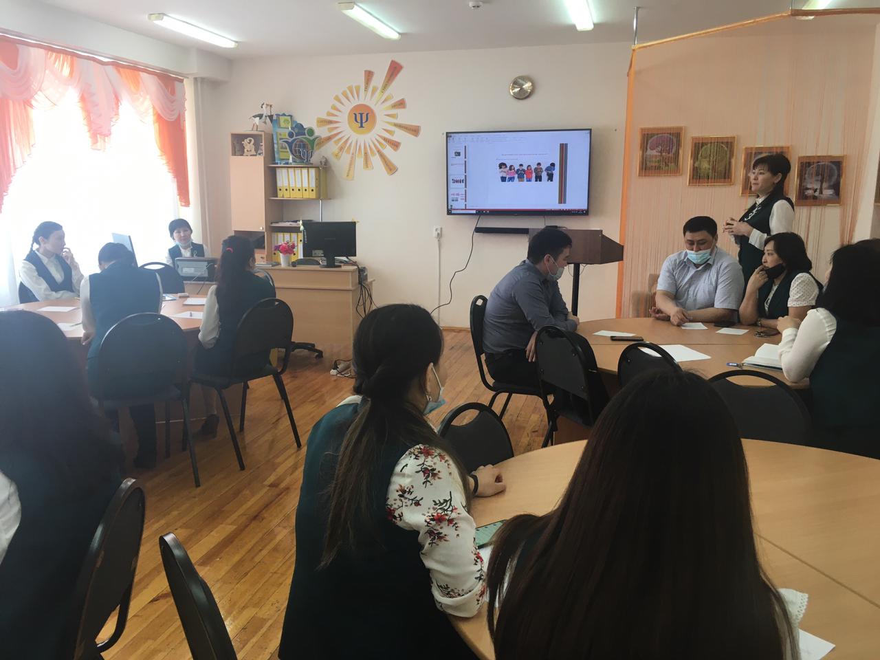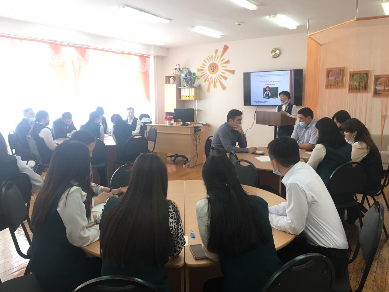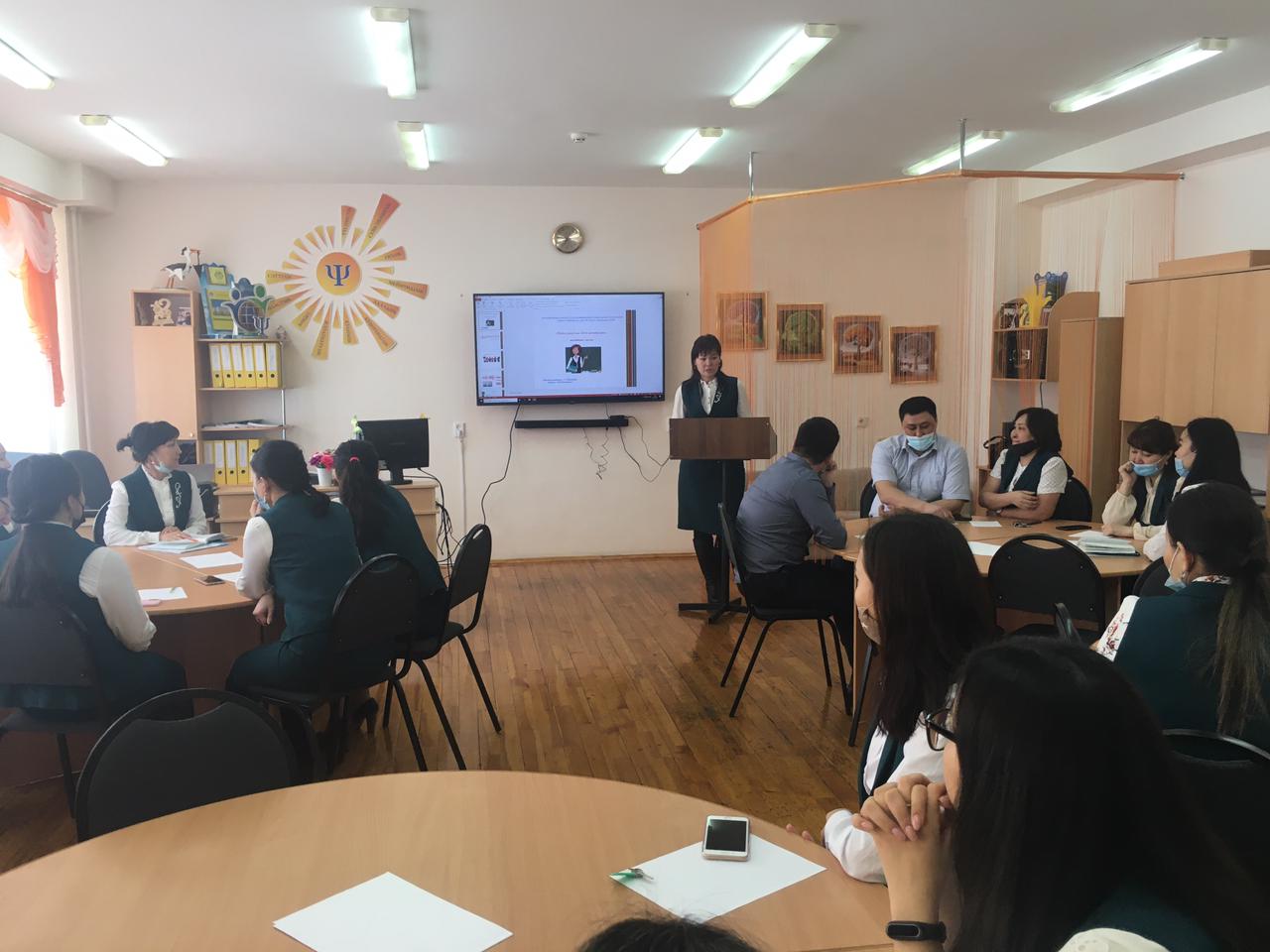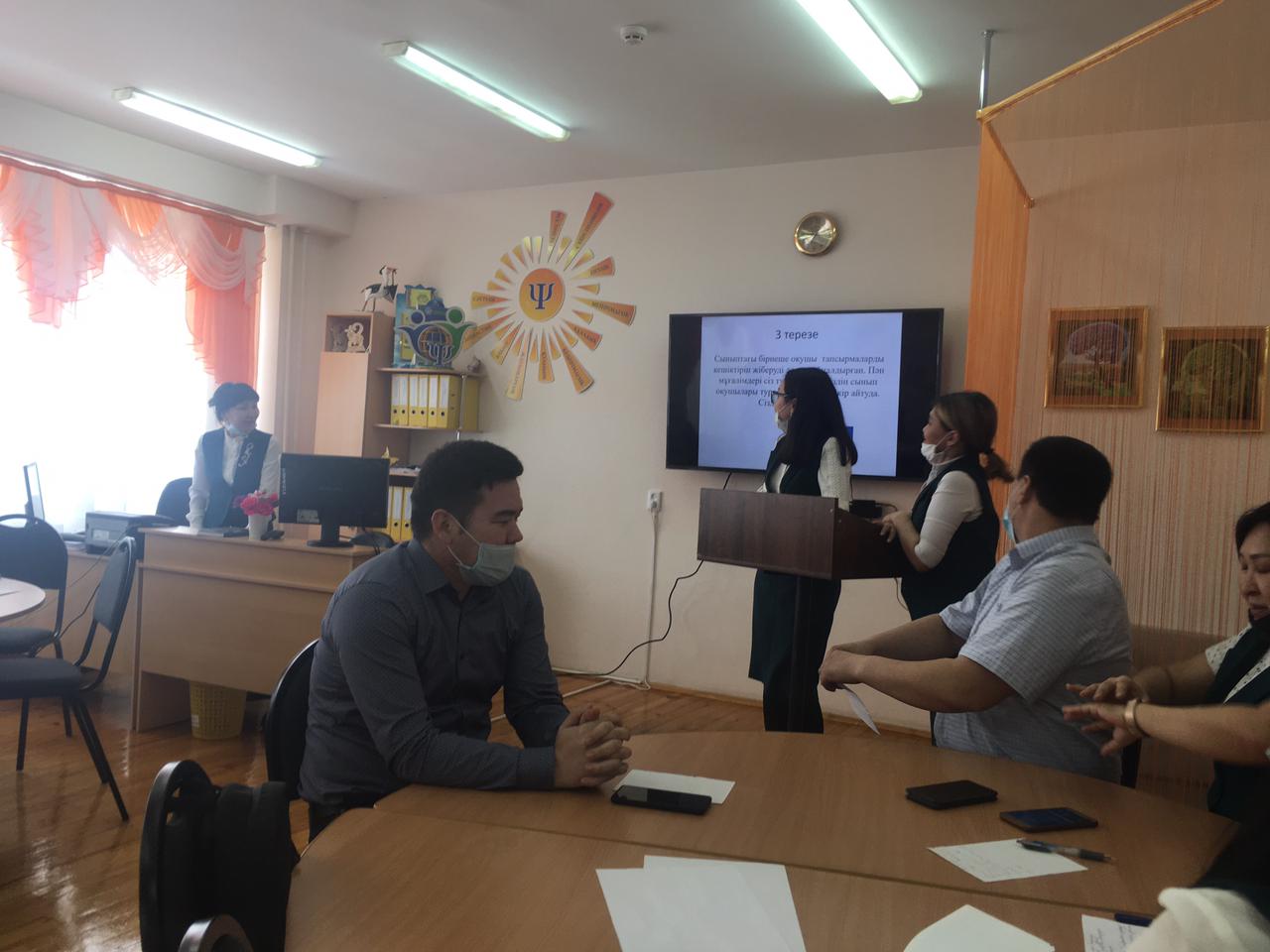 Директордың әдістеме жөніндегі орынбасары мұғалімдерге "Педагог мәртебесі" Заңында 5-бапта педагог әдебі туралы айтылған тармақтарға тоқталып өтті. Әрі қарай мектеп педагог-психологі Искендирова М.Ж. педагог қызметінде кездесетін әр түрлі жағдаяттарға байланысты топтарға тапсырмалар беріп, топ мүшелерінің пікірлері ортаға салынды. Тәжірибелі мұғалімдер өз практикаларымен бөлісті.