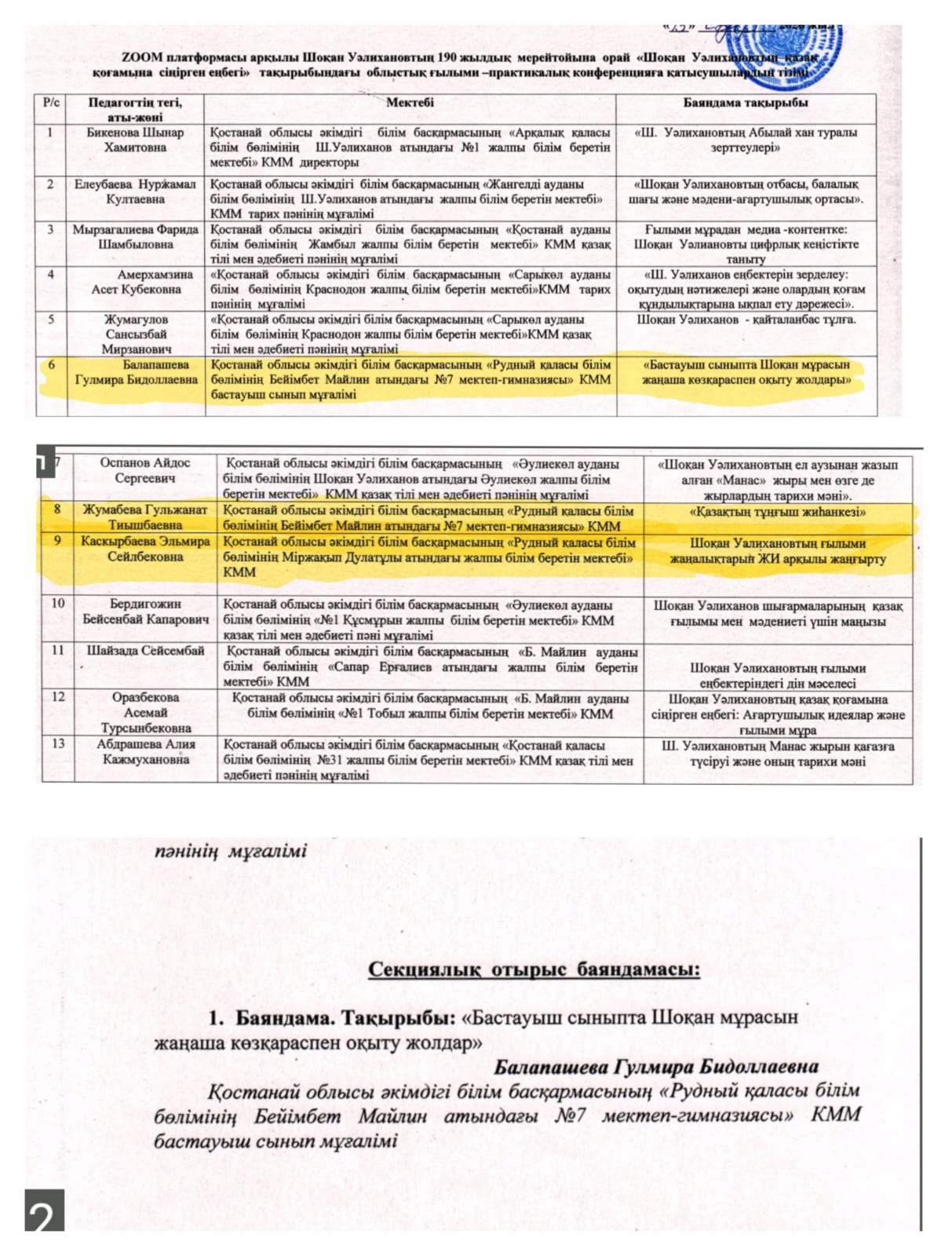 «Шоқан Уалихановтың қазақ қоғамына сіңірген еңбегі» тақырыбындағы облыстық ғылыми-тәжірибелік конференциясына мектебімізден екі жұмыс өтіп, Г.Т.Жұмабаева "Қазақтың тұңғыш жиһанкезі", Г.Б.Балапашева "Бастауыш сыныпта Шоқан мұрасын жаңаша көзқараспен оқыту жолдары" тақырыптарында өз тәжірибелерімен бөлісті. Конференция барысында ғалымның еңбектерін таныстырып қана қоймай, оларды қазіргі заманмен байланыстырып, бүгінгі жастардың ұлттық құндылықтарды жаңаша көзқараспен зерттеуіне мүмкіндік бар екені айтылды.